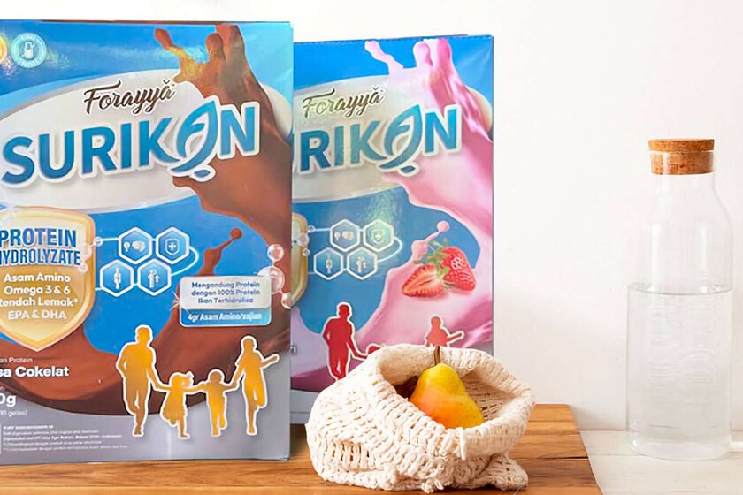 Surikan, esta leche de pescado. El aviso está chiquitito arriba a la izquierda