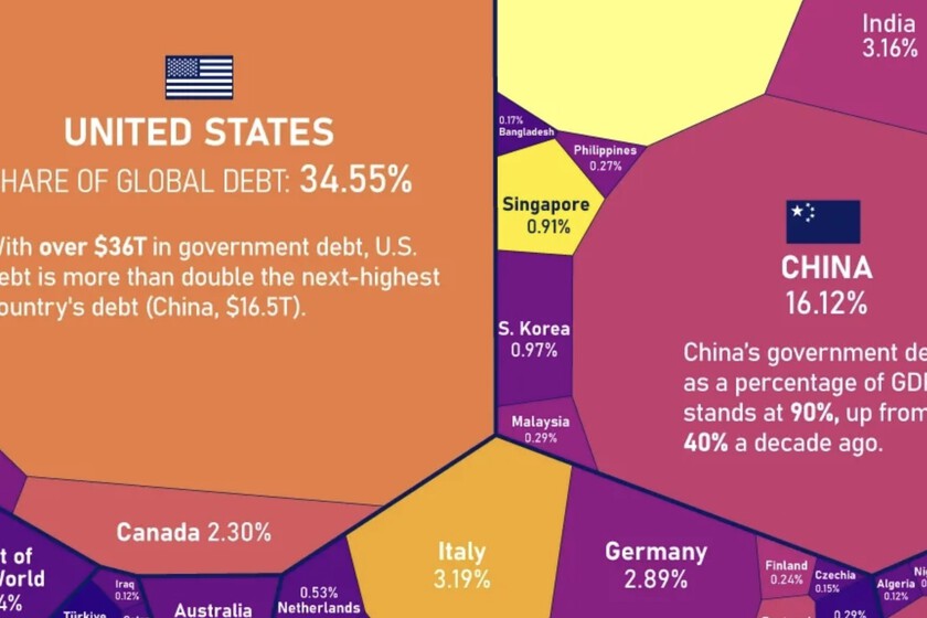 Tenemos un montón de indicadores que permiten explicar la realidad financiera de la economía global. La deuda es uno de ellos y, como decimos, no es el único ni el más determinante, sí es el que se utiliza para analizar el futuro de muchos países. Liderar el ranking de la deuda global no es el mayor de los honores, y en este curioso gráfico podemos ver no sólo quiénes acumulan más deuda en 2024, sino también el porcentaje de deuda relacionado con su producto interior bruto.
