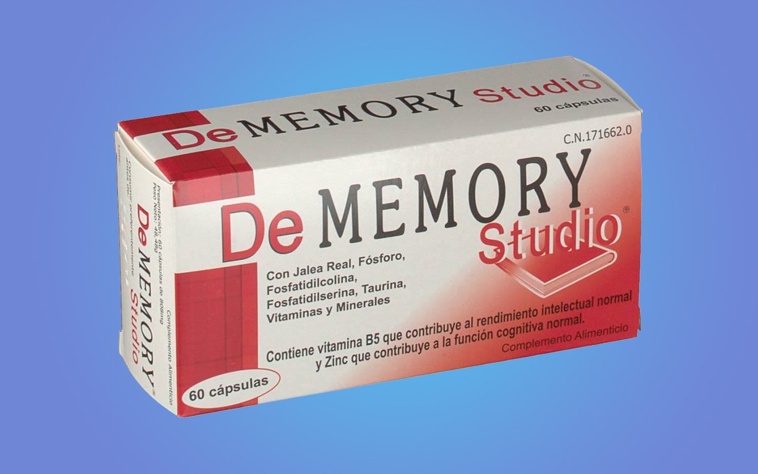 Los ingredientes de DeMemory Studio son los siguientes: Fosfatidilcolina (164mg), Fosfatidilserina (2mg), Taurina (100mg), Jalea Real (50mg), vitaminas (A, E, C, B1, B2, B3, B5, B6, B8, B9 y B12), Calcio, Fósforo, Zinc y Manganeso. Eso es lo que indica la marca.