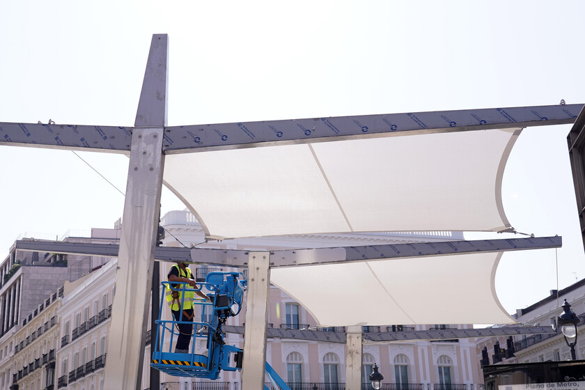 Con el termómetro tonteando con los 40ºC de máxima y un sol de rigor, si algo hay hoy demandado en las calles de Madrid es sombra, un refugio en el que disfrutar de una tregua refrescante antes de seguir camino de la oficina, casa o el instituto. Para crear uno de esos ‘refugios climáticos’ en pleno corazón urbano, hace unas semanas el Ayuntamiento empezó a instalar toldos en plena Puerta del Sol, 32 paneles con los que quiere que la plaza deje de ser una sartén.