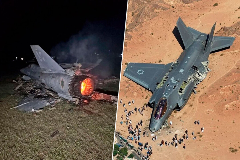 Las fotos en cuestión. Al mismo tiempo que un medio iraní publicaba la noticia de que Irán había derribado un F-35 israelí, dos imágenes empezaron a correr como la pólvora en redes sociales, aunque pronto supimos que eran falsas. Una de ellas, la del F35 estrellado y rodeado de curiosos, es especialmente llamativa. Para empezar, las proporciones no tienen ningún sentido: el avión parece gigante cuando en realidad mide 16 metros y las personas son más grandes que los edificios. Y eso por no mencionar que los daños del avión son mínimos para haber sido derribado.