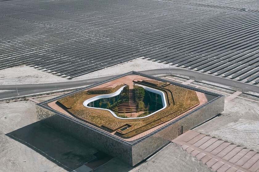 La cubierta alberga paneles solares a lo largo de sus cuatro aristas, y cuenta con una zona verde desde la que se contemplan los 20 kilómetros cuadrados de granja fotovoltaica, el equivalente a 2.800 campos de fútbol llenos de paneles solares.