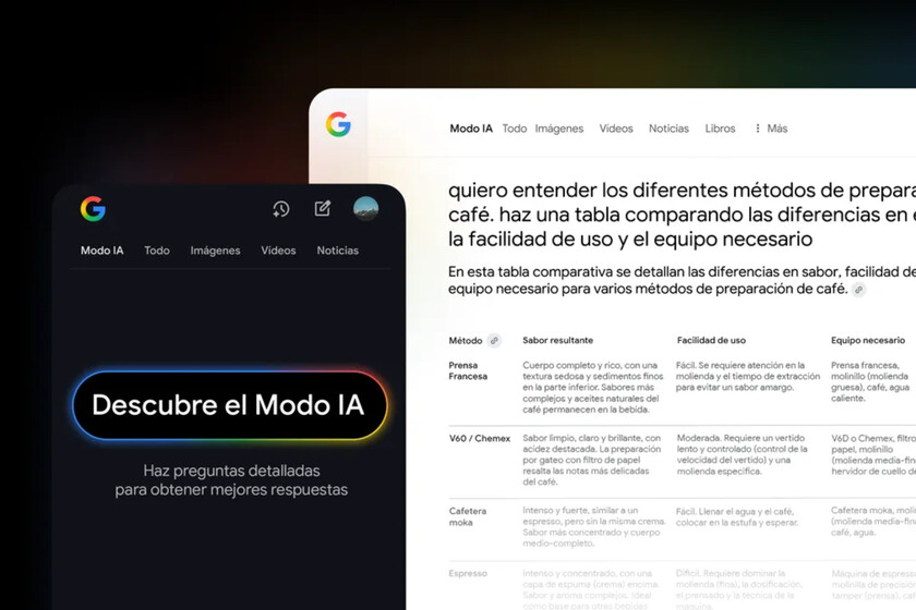 Por qué cambia la forma de buscar. Según Google, esta herramienta está diseñada para preguntas exploratorias sin una respuesta única y directa. En Estados Unidos, donde se lanzó en marzo (y ya por aquel entonces pudimos probarlo), Google asegura que los usuarios hacen preguntas dos o tres veces más largas que en las búsquedas convencionales. La compañía pone el ejemplo de hacer la siguiente búsqueda: «Quiero entender los diferentes métodos de preparación de café. Haz una tabla comparando las diferencias en el sabor, la facilidad de uso y el equipo necesario». Una vez obtenida la respuesta, podemos seguir la conversación, como por ejemplo: «¿Cuál es el grosor ideal del grano para cada método?». De esta forma, el sistema mantiene el contexto de la conversación y permite profundizar sobre la marcha.